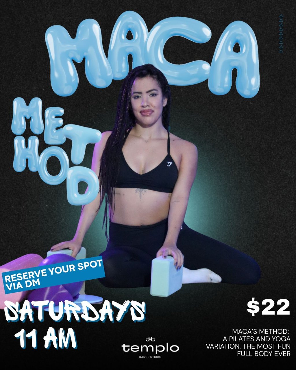 Maca's Method is a unique movement practice in Orlando that blends principles of Pilates and Yoga, designed specifically to help dancers improve strength, mobility, balance, and body awareness. This training supports dancers of all levels by enhancing control, flexibility, and injury prevention while elevating overall performance. Classes take place every Saturday in Orlando and are limited to only 12 spots, ensuring personalized attention and focused growth for each dancer.